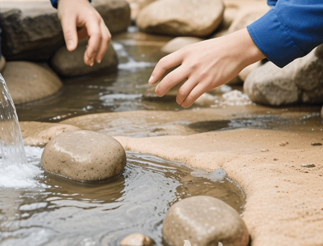 Gemeinsam gestalten wir einen kleinen künstlichen Fluss mit Sand und Steinen. Wir testen, wie Strömungen wirken, Dämme gebaut werden und das Wasser seinen Weg findet.